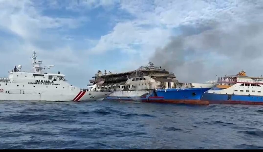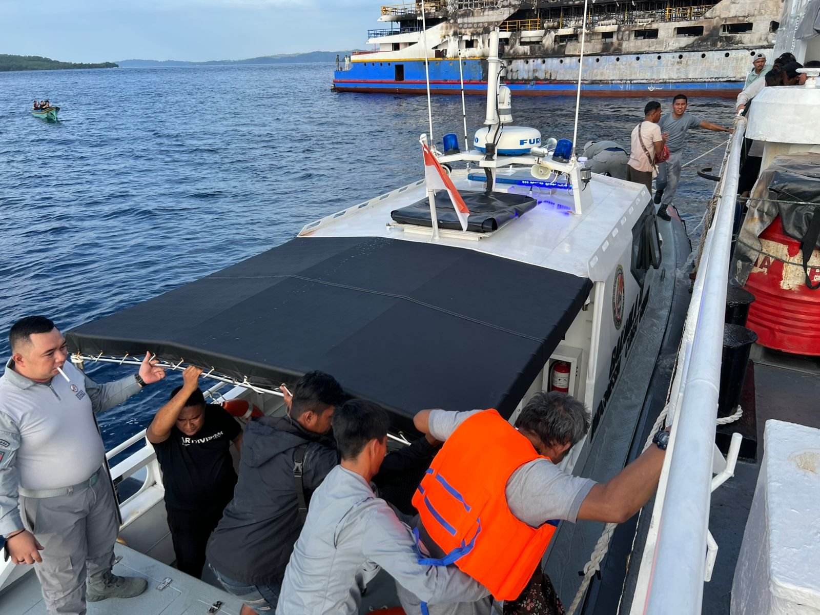 Manado — Bakamla RI melalui unsur KN Gajah Laut-404 dan HSC 32-03 melakukan aksi cepat tanggap darurat dalam membantu proses evakuasi penumpang KMP Barcelona 5 yang mengalami musibah kebakaran di perairan Pulau Talise, Kecamatan Likupang Barat, Kabupaten Minahasa Utara (Minut), Minggu (20/7/2025).