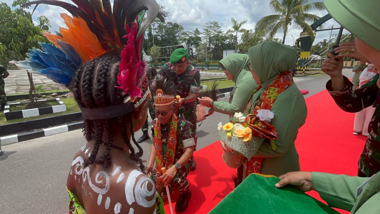 Timika – Dandim 1710/Mimika Letkol Inf M. Slamet Wijaya, S.Sos,.M.Han,.M.A. sambut kedatangan Pangdam XVII/Cenderawasih Mayjen TNI Amrin Ibrahan, S.I.P beserta Ibu saat melaksanakan kunjungan kerja ke Kodim 1710/Mimika, Senin (20/10/2025).