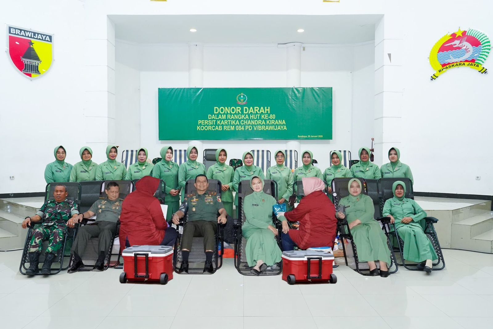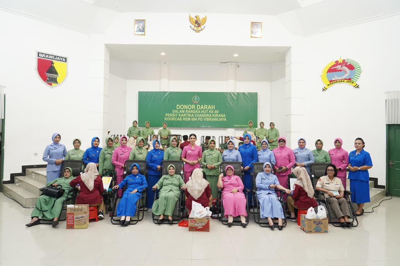 SURABAYA – Persit Kartika Chandra Kirana Koorcab Rem 084 PD V/Brawijaya melaksanakan kegiatan Donor Darah dalam rangka Hari Ulang Tahun (HUT) ke-80 Persit Kartika Chandra Kirana. Kegiatan tersebut berlangsung di Aula Makorem 084/BJ, Jalan Ahmad Yani No. 1, Surabaya, Kamis (29/1/2026).
