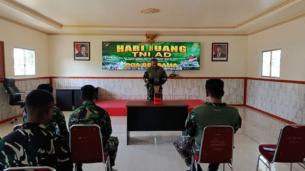 Timika – Dalam rangka memperingati Hari Juang Ke-80 TNI AD Tahun 2025, Kodim 1710/Mimika menggelar kegiatan do’a bersama dilaksanakan secara terpimpin bertempat di Masjid Al-Askar untuk yang beragama Muslim dan di Ruang Rekreasi Makodim bagi prajurit beragama Nasrani, Jumat (12/12/2025).