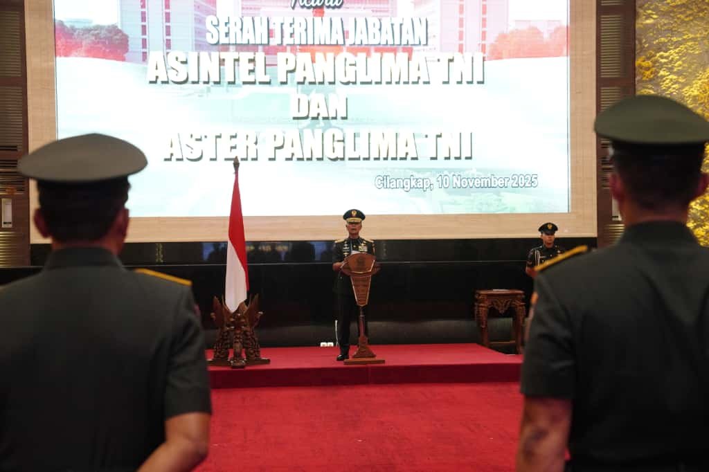 Jakarta– Kepala Staf Umum (Kasum) TNI Letjen TNI Richard Tampubolon mewakili Panglima TNI Jenderal TNI Agus Subiyanto memimpin upacara Serah Terima Jabatan (Sertijab) Asisten Intelijen (Asintel) Panglima TNI dari Mayjen TNI Krido Pramono, S.H., M.Si., kepada Mayjen TNI Rio Firdianto, S.H., dan Asisten Teritorial (Aster) Panglima TNI dari Mayjen TNI Jimmy Ramoz Manalu, S.Hub.Int., M.H.I, kepada Mayjen TNI Suhardi. Acara berlangsung di Aula Gatot Subroto, Mabes TNI, Cilangkap, Jakarta Timur, Senin (10/11/2025).