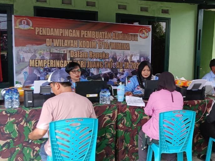 Timika – Dalam rangka memperingati Hari Juang TNI AD, Kodim 1710/Mimika melalui Koramil 1710-02/Timika menggelar kegiatan pendampingan pembuatan administrasi kependudukan (Adminduk) bagi masyarakat, bertempat di Makoramil 1710-02/Timika, Jalan Yos Sudarso, Jumat (5/12/2025).