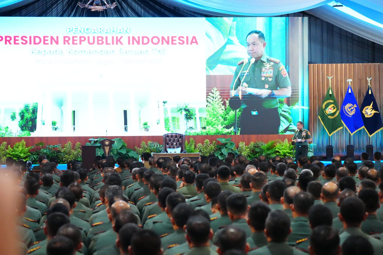 JAKARTA– Presiden Republik Indonesia Prabowo Subianto didampingi Panglima TNI Jenderal TNI Agus Subiyanto bersama Kepala Staf Angkatan menghadiri dan memberikan arahan kepada para Komandan Satuan (Dansat) Jajaran TNI, bertempat di Istana Kepresidenan Bogor, Jawa Barat, Jum’at (07/02/2025).