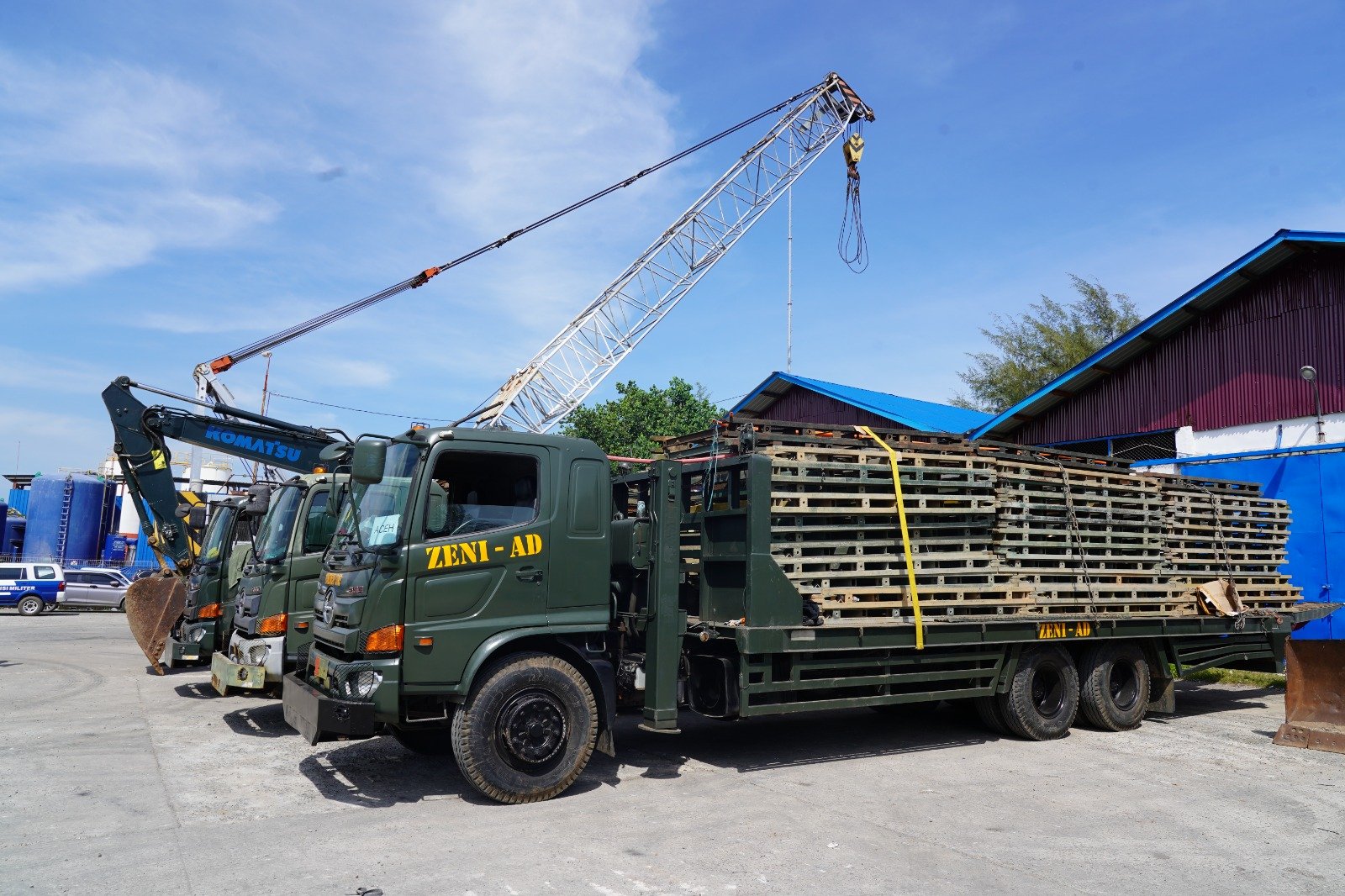 Materiil tersebut meliputi dua set jembatan Bailey, empat unit truk tronton alkap jembatan, satu unit crane berkapasitas 25 ton, satu unit truk NPS, serta satu kendaraan double cabin Triton.